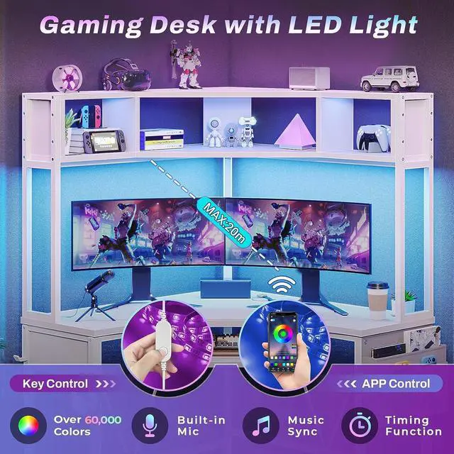 The corner gaming desk comes with RGB LED light strip, remote control via APP, Over 60000 colors and 29 flashing modes for your to choose. Led light strip with music sync function, built-in sensitivity adjustable mic, led light color will change with the rhythm of the sound and music.