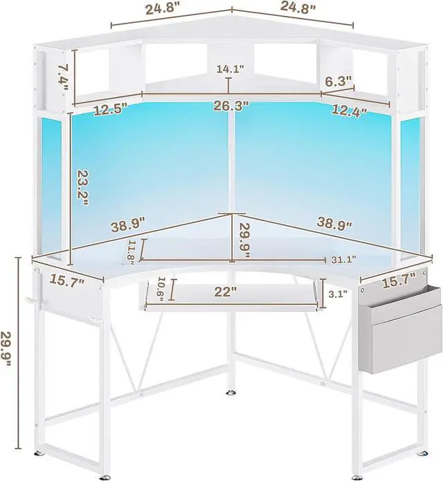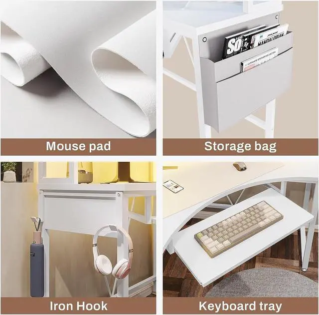 Corner desk with 2-tier storage shelves, keyboard tray, storage bag and headphone hook can help you quickly and efficiently classify storage. 2-tier storage shelves can place printer, books, photo albums, documents, storage baskets etc. corner desk with storage bag is easily to keep your desk tidy.