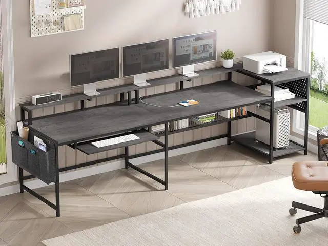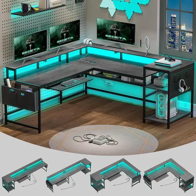 L shaped computer desk comes with a power outlet, keyboard tray, led strip, storage bag, peg board, and 3-tier storage that hold 2 monitors, 1 notebook, printer stand, file, and books. A large work area can hold two desktop computers and one notebook, which can help you organize your workspace more efficiently.