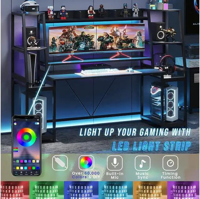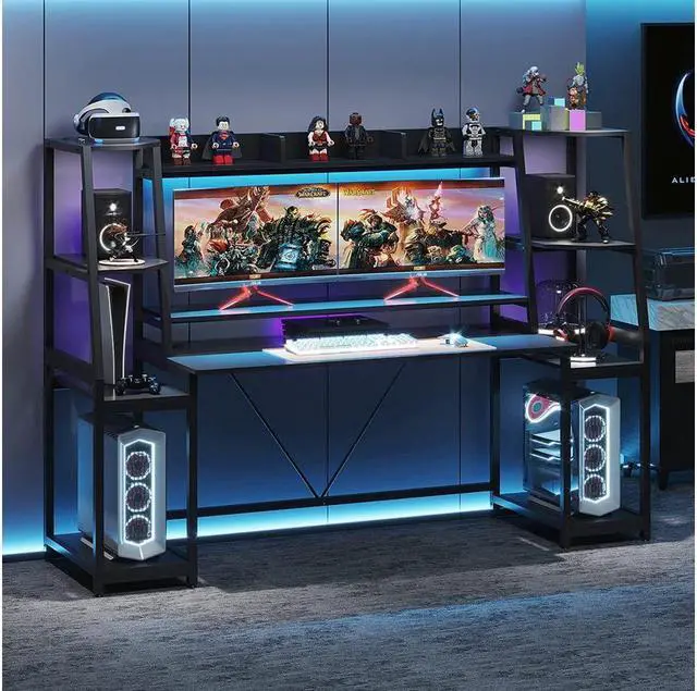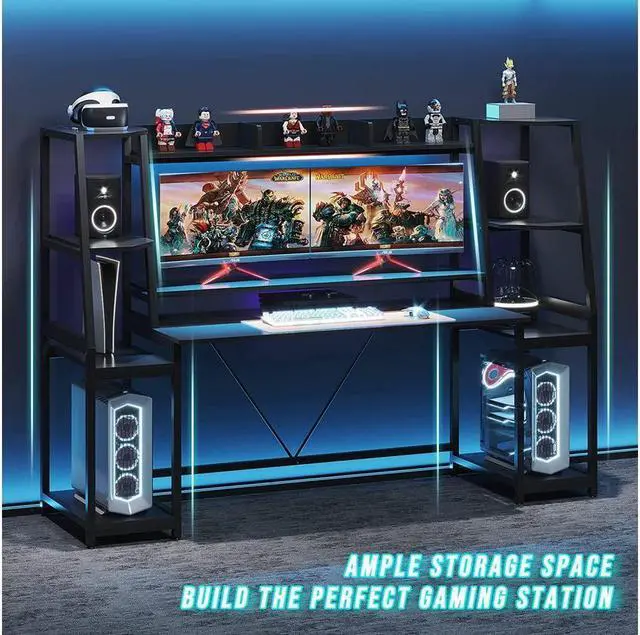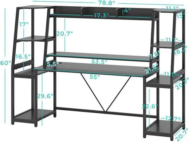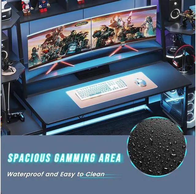 This gaming desk features 2 large storage shelves, use the 2 storage shelves for storing your large CPU / PC tower, books, speakers, PS4 & Xbox, gamepad and other game gears. Top hutch can hold figures, books, plants, etc. 55" (L) * 21.6" (W) desktop can easily accommodate your keyboard, mouse, accessories and more. The large workstation can hold 2 computers at the same time.