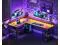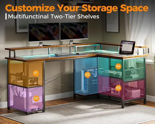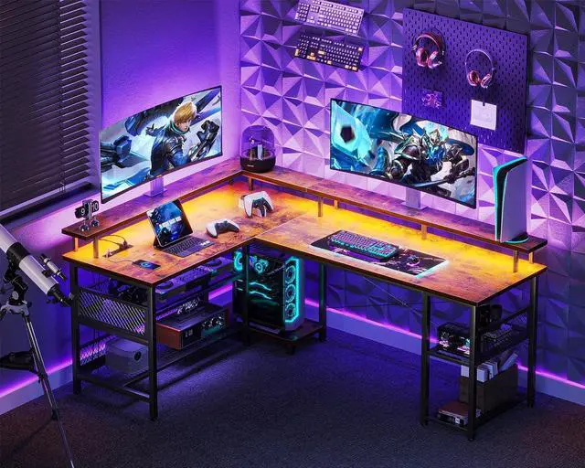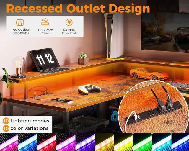 This l shaped desk with shelves features built-in LED lighting in 7 colors, 13 modes, 8 adjustable brightness levels, and 9 flicker frequencies to create an immersive gaming atmosphere. It has memory function to keep the LED lights staying on last mode when turned on.