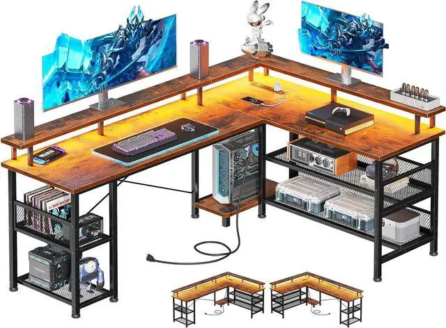 66" L Shaped Gaming Desk with Power Outlet and LED Lights, Reversible L Shaped Desk with Storage Shelves & Monitor Stand, Gaming Desk with USB Ports, Home Office Desk - Brown