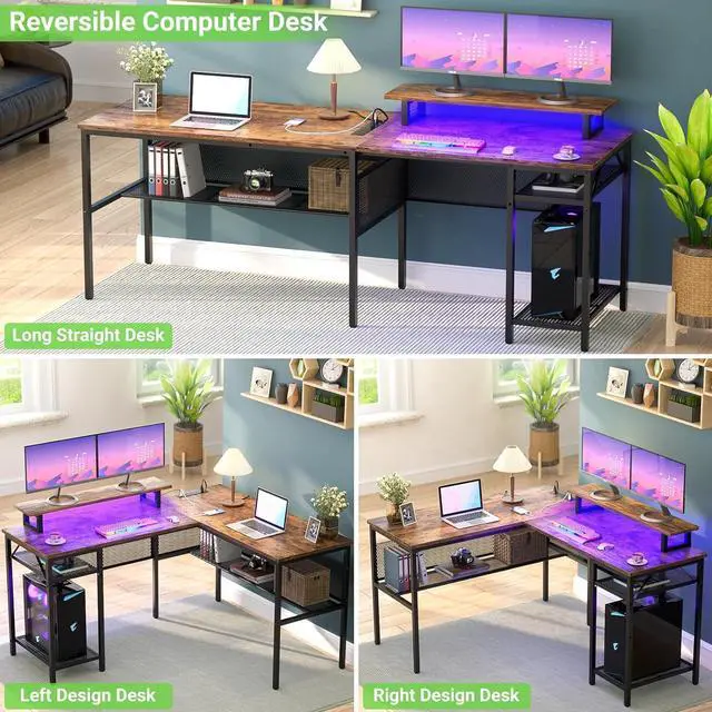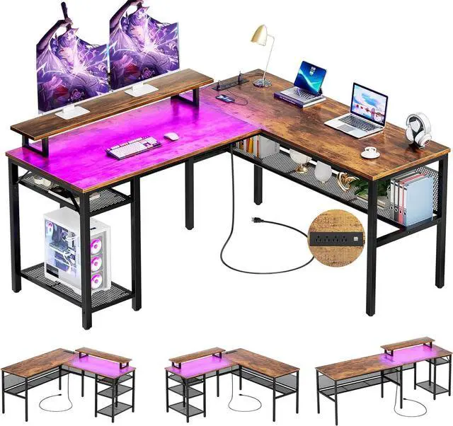 MAGIC POWER OUTLETS AND FLEXIBLE MONITOR STAND The flexible monitor stand of l shaped desk allows for more spaces and helps to reduce your neck strain with a better sitting posture by providing an ergonomic sight level. The corner computer desk is built in 4 power outlets and 2 USB charging ports. It provides extra power support for your computer, printer, scanner, phone, tablet, gaming gear etc, which provides a great convenience to your life when you are working, writing or playing games.
