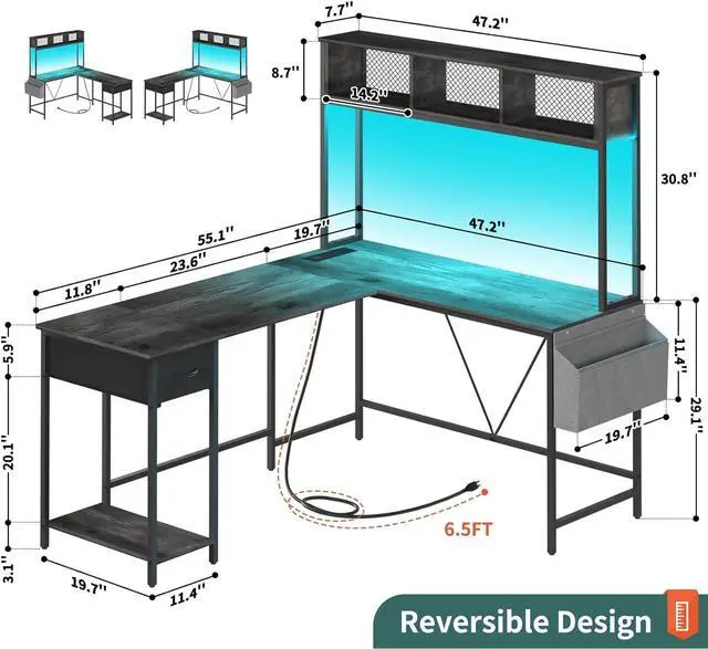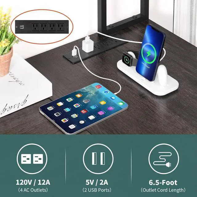 4 AC outlets & 2 USB portsEquipped with 4 AC outlets and 2 USB ports, the l shaped gaming desk provides fast charging for your work and gaming devices, fully meets the demands of your charging needs. Say goodbye to the hassle of finding power outlets around the room. Plus, a 6.5 ft power cord allows you to place this small computer desk wherever you please.