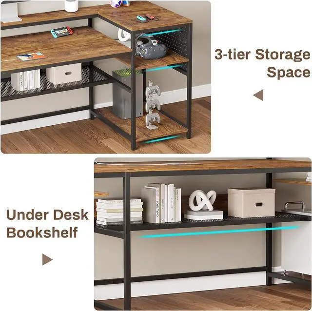 L shaped computer desk comes with a power outlet, keyboard tray, led strip, storage bag, peg board, and 3-tier storage that hold 2 monitors, 1 notebook, printer stand, file, and books. A large work area can hold two desktop computers and one notebook, which can help you organize your workspace more efficiently.