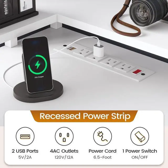 • The L shaped computer desk includes a built-in power strip with 4 outlets & 2 USB Ports provides convenience for charging your gaming gear, tabletprinter or phone.Don't worry about not having enough power sockets. Also includes an on-off switch, thanks to the on-off switch, one-button power off to ensure safe electricity use, which strengthens security.