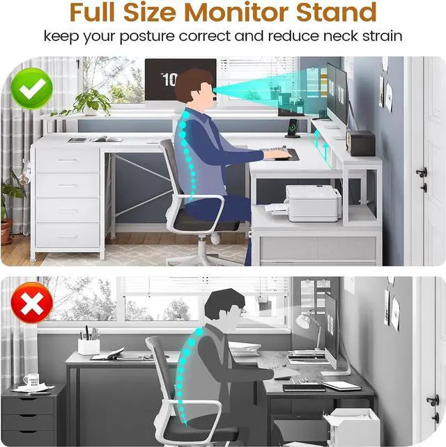 Ideal SpaceThis computer desk has a spacious desktop. The desktop size is 65"L*19"W and 62.2"L *19"W or 108 inch two person desk. The printer rack can be used for printers of any size commonly seen on the market. The L shaped computer desk could hold three desktop computers and one notebook computer. This computer desk can also be freely deformed into a long square or L-shaped desk according to your use needs.