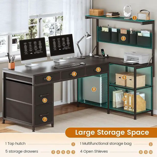 Create a versatile workstation thatll meet all your needs with this all-in-one l shaped gaming desk with 5 drawers, storage shelves, power outlet and LED lights, CPU Stand. It's finished on all sides for versatile placement throughout your office.