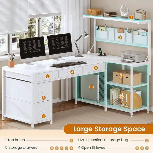 Create a versatile workstation thatll meet all your needs with this all-in-one l shaped gaming desk with 5 drawers, storage shelves, power outlet and LED lights, CPU Stand. It's finished on all sides for versatile placement throughout your office.