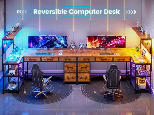 Create a versatile workstation thatll meet all your needs with this all-in-one l shaped gaming desk with 5 drawers, storage shelves, power outlet and LED lights, CPU Stand. It's finished on all sides for versatile placement throughout your office.