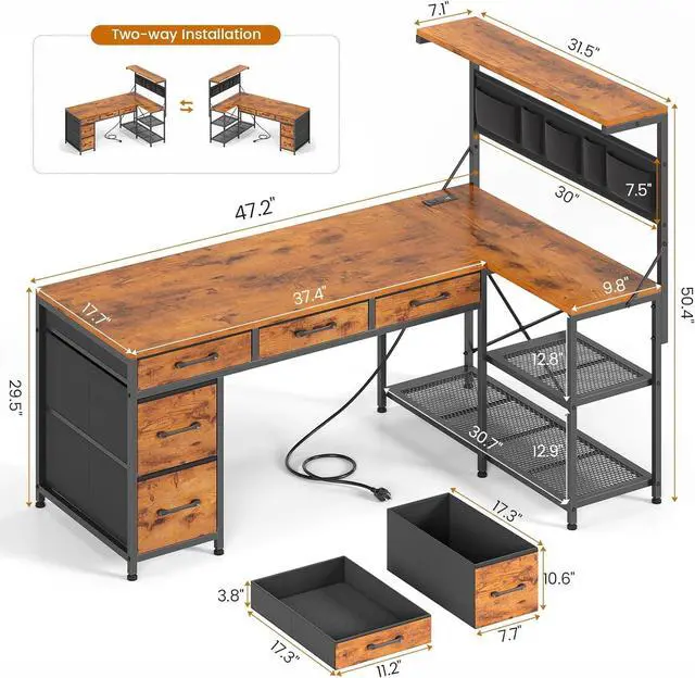 • Coming with a multifunctional storage bag, 4-tier storage shelves and 5 storage drawers with powerful storage space. The 4-tier can place files, books, leaving spacious space for writing, paperwork and other home office activities. This corner computer desk provides enough room to study, work or other office activities.