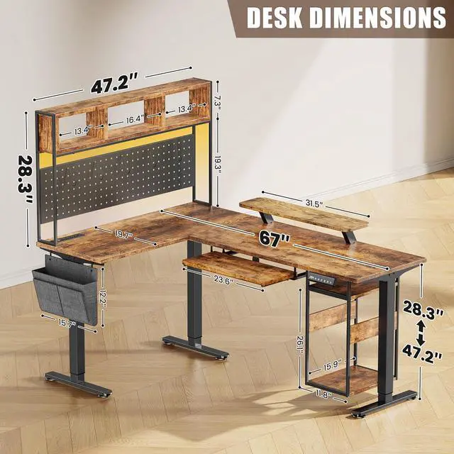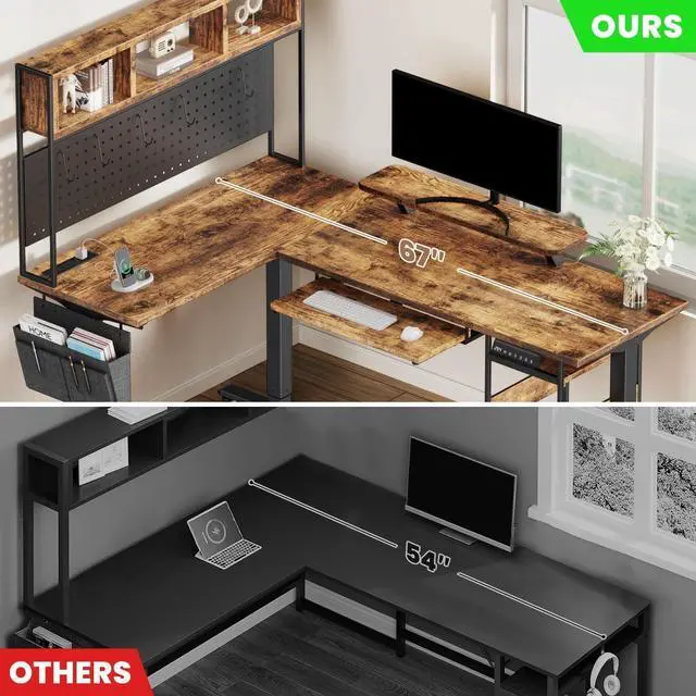 AMPLE STORAGE SPACE: The L shaped standing desk with powerful storage space for storage shelve (5 S-Hooks), storage pocket, keyboard tray, and host shelf. This gaming desk with hutch provides ample space for 3-4 monitors and books, gaming gear, office supplies, and more. The storage pocket of this computer desk is perfect for keeping other frequently used items. Maximize your desktop space with the keyboard tray and host shelf. An ideal home office desk for your room!