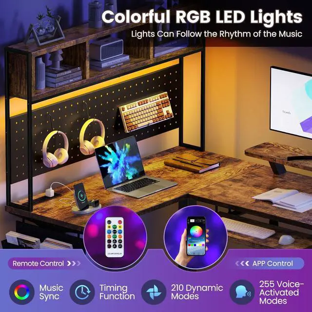 RGB LED LIGHTS & BUILT-IN POWER OUTLET: The gaming desk with LED lights is equipped with 7 RGB colors, 210 dynamic modes and 255 voice-activated modes via APP or remote control. It can follow the rhythm of the music to enhance the sense of gaming ambience. Equipped with 4 AC outlets and 2 USB ports, which can easily charge your phone, ipad, notebook and more while working or playing games. No need for extra sockets to increase your efficiency and keep your desk tidy.
