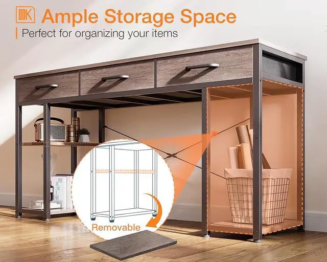 All-in-one Versatility Computer DeskThe perfect desktop size ( 47.3 inch* 15.7 inch) fits your laptop, books and 3 large capacity fabric drawers (each drawer can support up to 8 lb, about 2 laptops). Ample room for all of your office or work- from-home needs! The detachable underneath storage shelves of the desk can be placed in any size so it works perfect for any usage. (Eg: books, organizer. ) There are also a lot more legroom and space for you.