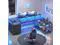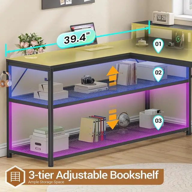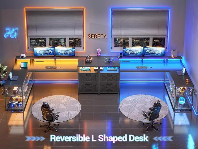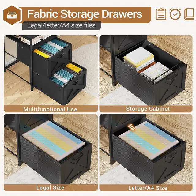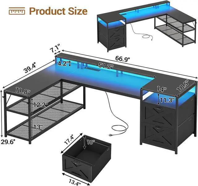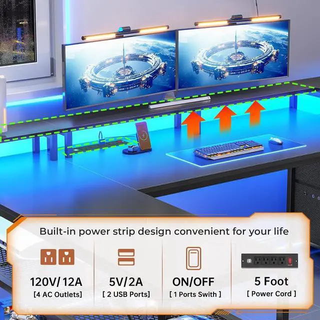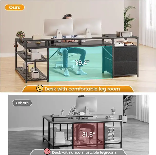Computer desk comes with 2 fabric file drawers, a power outlet with a switch, 2 under desk bookshelves, LED lights, 2 headphone hooks, and an extra long desk monitor shelf that can hold 2-3 monitors. The office desk could hold 2-3 desktop computers and 1 printer. An ideal desk for small rooms to create excellent home office space.
