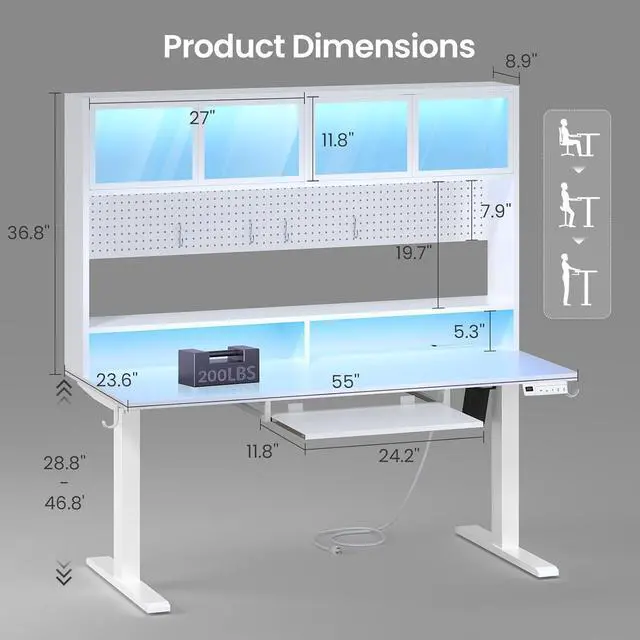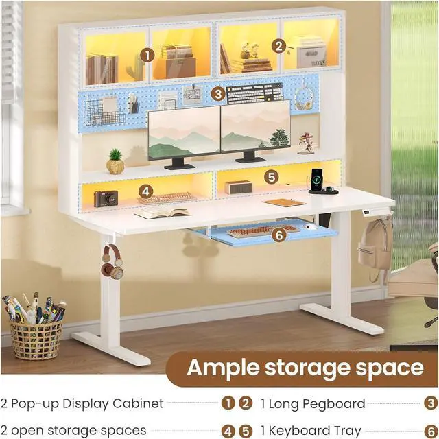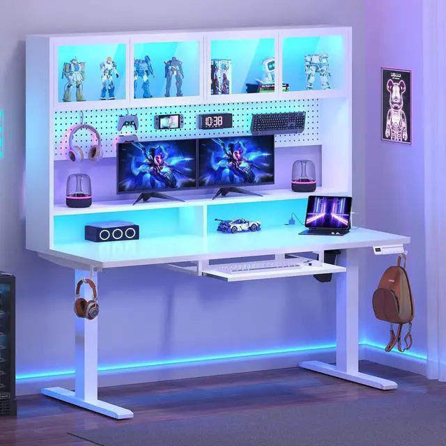 55" Electric Standing Desk with Storage, Height Adjustable Gaming Desk with Hutch and Pegboard, Sit Stand Up Desk with Led Lights, Power Outlet, Monitor Shelf, Keyboard Tray for Home Office, White