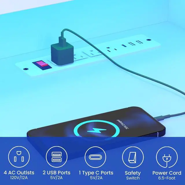 Charging Port & Smart Led LightThis gaming standing desk includes a built-in power strip with 4 outlets, 2 USB ports, and 1 Type-C port for charging all your gearphones, tabletsprinter or phoneplus a master switch for safe power control. Integrated smart RGB LED lighting offers 60,000+ colors and 29 dynamic modes, syncs to music via an adjustable mic, and is controllable via remote or app for immersive gameplay or vibrant home office energy.