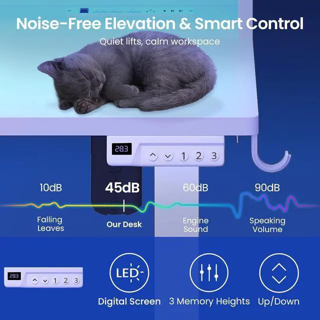 Built to Last with Exceptional StabilityThe industrial-grade steel frame and T-shaped design of the stand up computer desk support up to 200 lbs. Desktop made of P2 particle board, sturdy durable and anti-scratched. And powered by a robust yet quiet motor (operating at less than 45 DB).