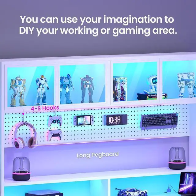 Display Cabinet & PegboardGaming desk comes with Display Cabinet and pegboard , provides ample space to display your decorations, photo albums, toys, and so on. The doors protect your items from dirt and ash and you can clearly see your decorations. Pegboard wall organizers make full use of wall space for the display and storage of small items. You can use your imagination to DIY your working or gaming area.