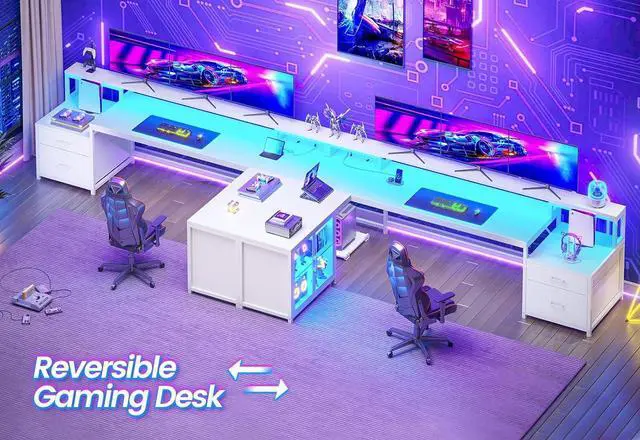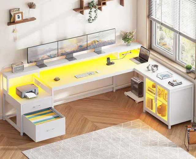 Display Cabinet & Led LightThe display cabinet can put the left or right according to your needs. The cabinet doors protect items from dust while allowing you to clearly admire your displays. The l shaped gaming desk comes with RGB LED light strip, remote control via APP, Over 60000 colors and 29 flashing modes for your to choose.