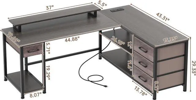 Better Experience with Larger Size:The overall dimensions are 60.2"W x 43.3" D x 29.5" H, the main desk size is 44.9"L x 18.5"W, and the side panel that can be switched left or right is 43.3"L x 15.4"W.