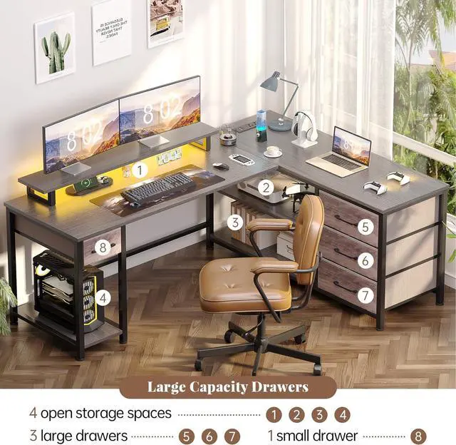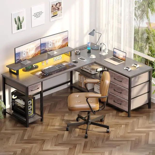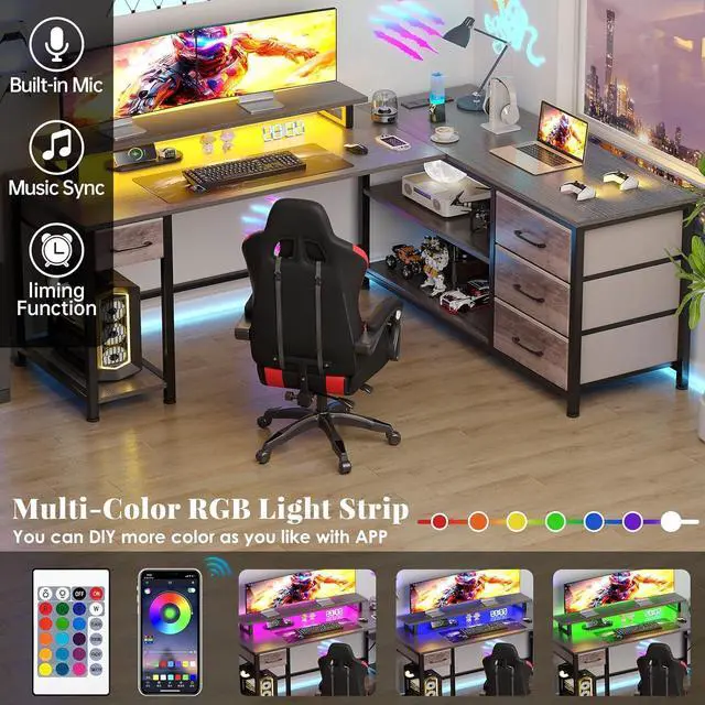 Reversible Design & Colorful LED Lights:The corner desk features interchangeable side panels that can be easily switched between left and right sides to suit your preferences. The storage shelves and drawers can meet your various storage needs at home or in the office. In addition, LED Lights can establish a comfortable working or gaming environment.