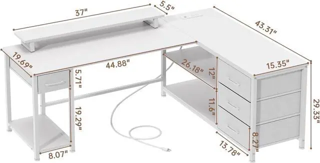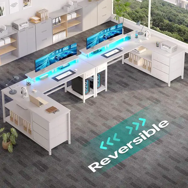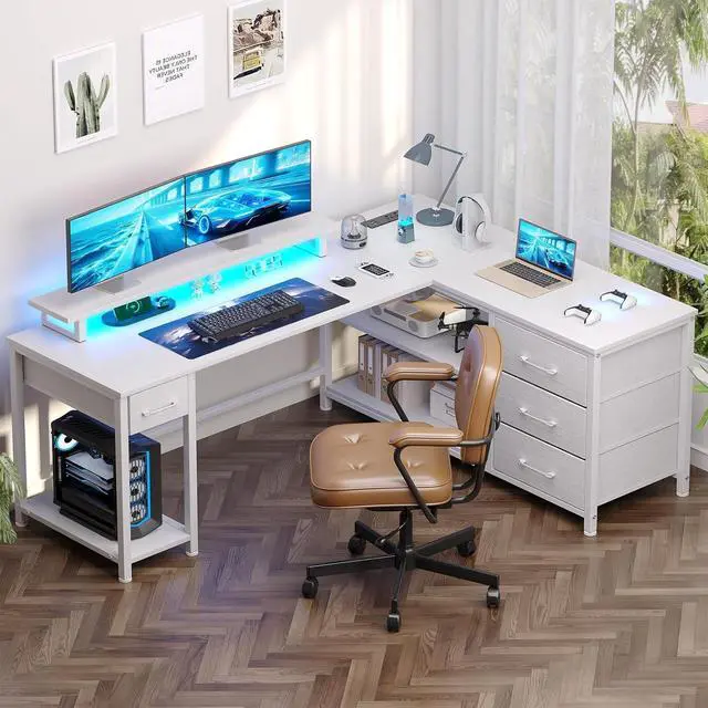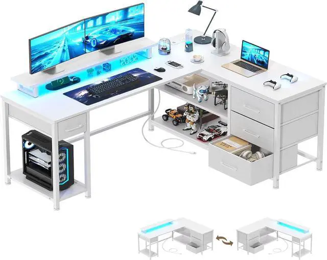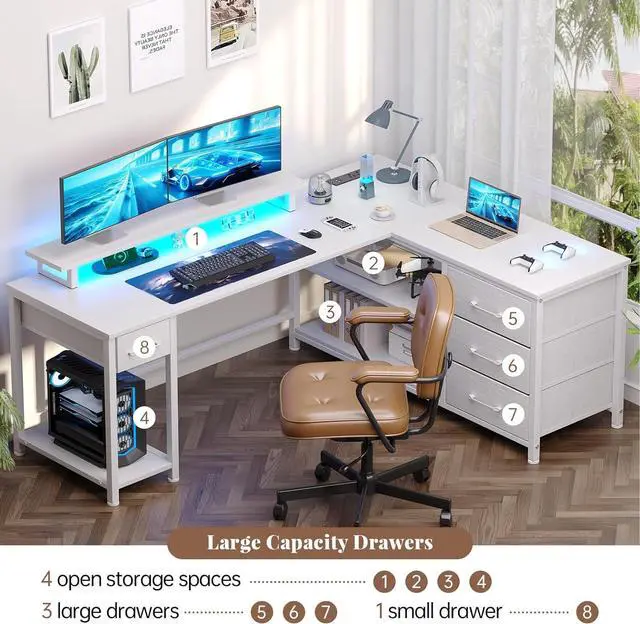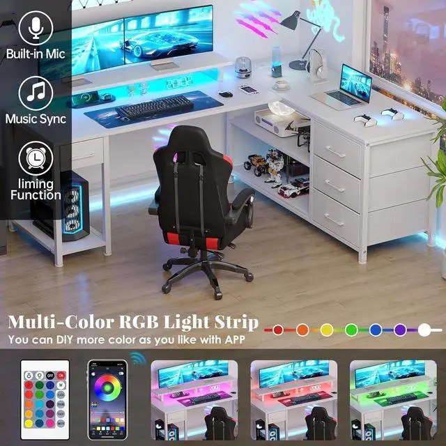 Reversible Design & Colorful LED Lights:The corner desk features interchangeable side panels that can be easily switched between left and right sides to suit your preferences. The storage shelves and drawers can meet your various storage needs at home or in the office. In addition, LED Lights can establish a comfortable working or gaming environment.
