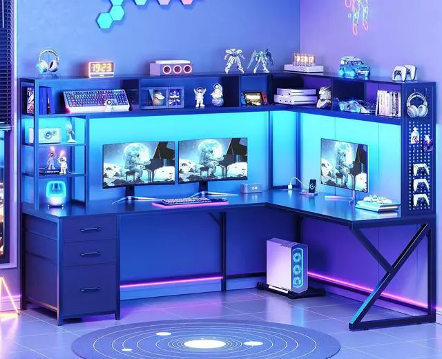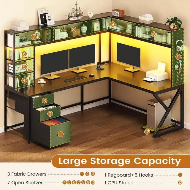 Large Storage SpaceL shaped computer desk with 7 open shelves, 3 fabric drawers, 1 pegboard and 1 CPU stand. This 66.1" l shaped desk has 7 open shelves , which offer enough space to store your daily items, books, files, printer stand or game figure, collect trophies, and souvenirs.