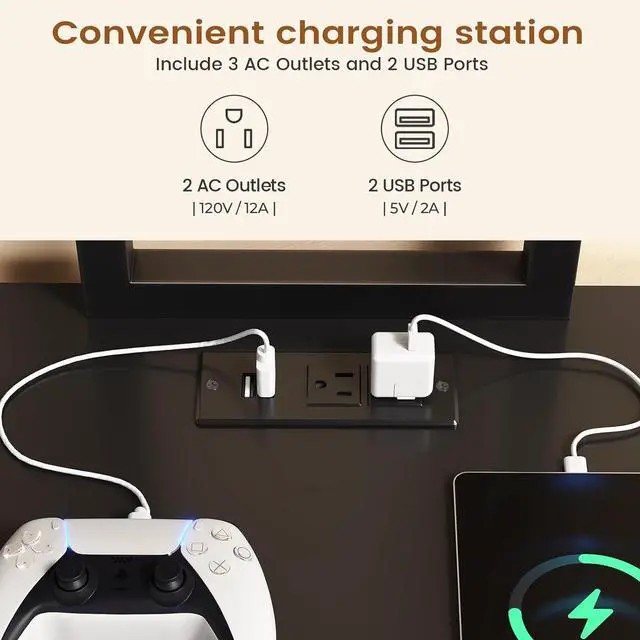 Power Outlet and Led LightThe L shaped computer desk includes a built-in power strip with 2 outlets and 2 USB Ports provides convenience for charging y. The l shaped gaming desk comes with RGB LED light strip, remote control via APP, Over 60000 colors and 29 flashing modes for your to choose.