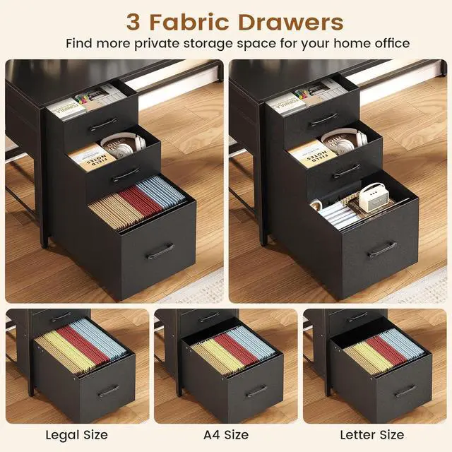 3 Fabric DrawersThe SEDETA l shaped gaming desk provides 3 easy to assemble fabric drawers. Drawers are made of breathable high-quality fabric, lightweight and easy to install. The file drawer can hold 3 sizes of files - Legal/Letter/A4, and 2 box drawer can place home or office items.