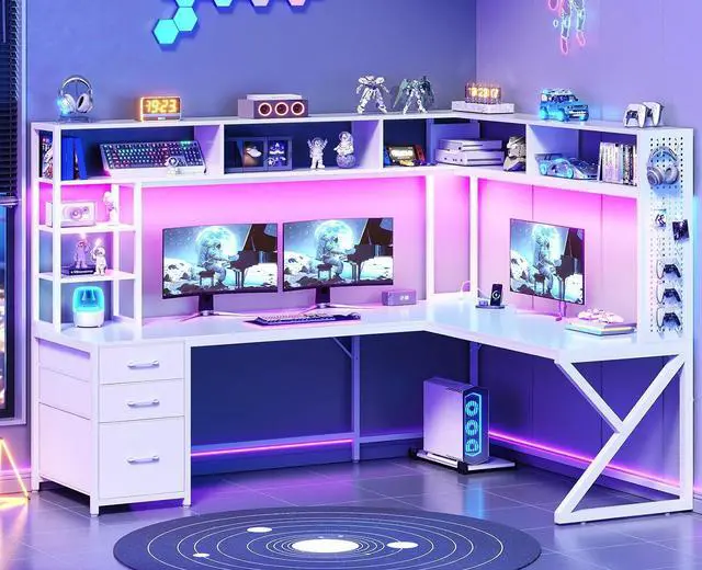 Large Storage SpaceL shaped computer desk with 7 open shelves, 3 fabric drawers, 1 pegboard and 1 CPU stand. This 66.1" l shaped desk has 7 open shelves , which offer enough space to store your daily items, books, files, printer stand or game figure, collect trophies, and souvenirs.