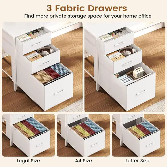 3 Fabric DrawersThe SEDETA l shaped gaming desk provides 3 easy to assemble fabric drawers. Drawers are made of breathable high-quality fabric, lightweight and easy to install. The file drawer can hold 3 sizes of files - Legal/Letter/A4, and 2 box drawer can place home or office items.