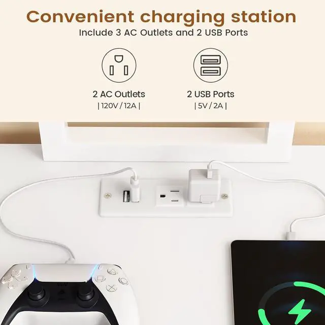 Power Outlet and Led LightThe L shaped computer desk includes a built-in power strip with 2 outlets and 2 USB Ports provides convenience for charging y. The l shaped gaming desk comes with RGB LED light strip, remote control via APP, Over 60000 colors and 29 flashing modes for your to choose.