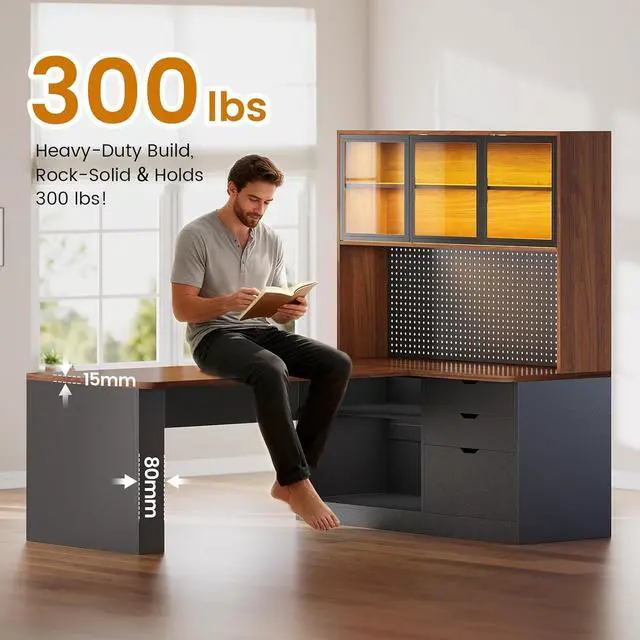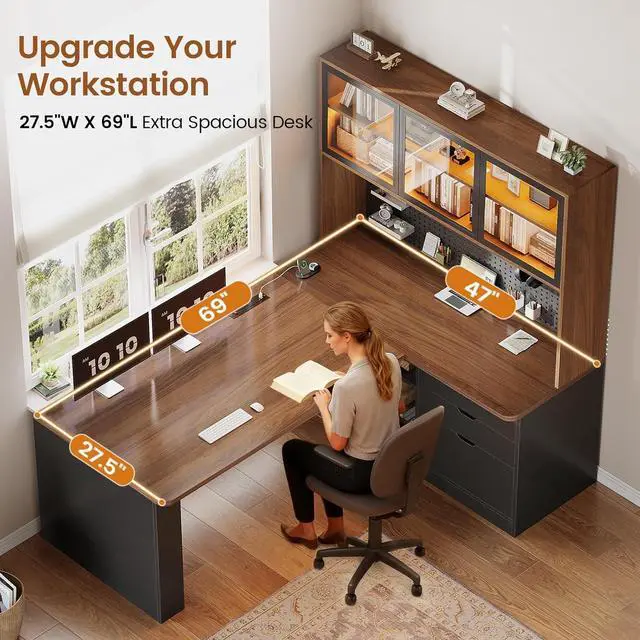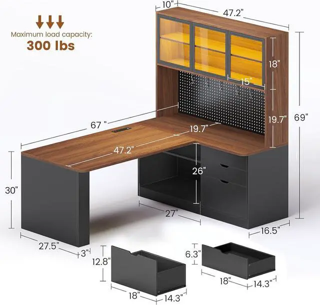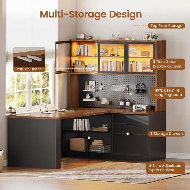 Massive Storage L-Shaped Desk with Shelves This brilliant L-shaped desk with storage transforms any corner into a highly functional workspace! It features 2-tier display cabinets with doors, a 47" DIY pegboard, 3 wooden drawers, and two adjustable open shelves. From books to collectibles, everything finds its perfect spot in the generously sized 47"L x 69"H bookshelf that outperforms competitors.