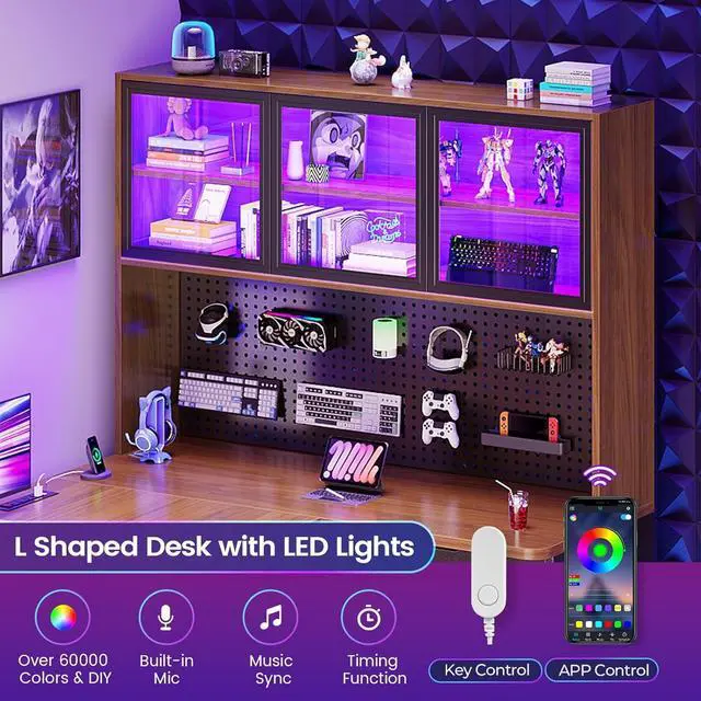 Immersive Gaming Desk with LED Lights & Display Level up your setup with this gaming desk with LED lights! It includes a 2-tier display cabinet with protective doors to showcase your collectibles, plus a vibrant RGB LED strip. Control over 60,000 colors and 29 lighting modes via the remote or app to create the perfect ambiance for gaming, working, or displaying your favorite items.