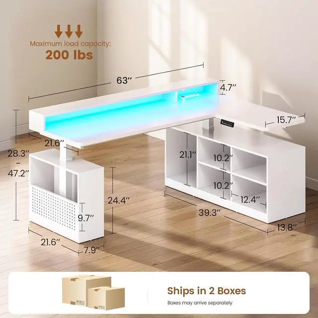 L Shaped Electric Standing Desk, 63 inch Gaming Computer Desk with Storage Shelves and LED Lights, Height Adjustable Office Desk with Power Outlet and Pegboard, (White)