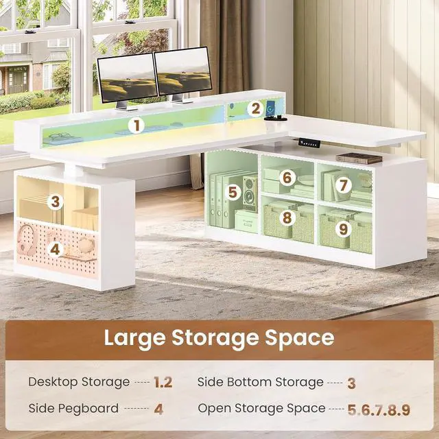Ample Storage SpaceThe 63 inch x 39.3-inch l shaped standing desk provides a spacious workspace. Equipped with side peg board, open storage shelves, and full size monitor stand for files, office supplies, or gaming devices. Ideal for keeping your living room, bedroom, or office tidy and organized.