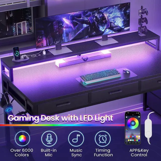 Cool & Smart Led LightThe PC desk comes with RGB LED light , remote control via APP, Over 60000 colors and 29 flashing modes for your to choose. Led lights with music sync function, built-in sensitivity adjustable mic, led light color will change with the rhythm of the sound and music. This gaming desk can meet you play games for your home offices.