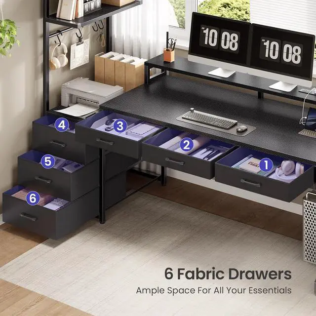 Ample Storage SpaceThis gaming table has a variety of storage space. The 6 cloth drawers can hold your smaller items, providing a larger desktop space for your gaming office. The hook design and open storage shelves can also be used to place your ornaments, adding to the gaming atmosphere and giving you a better gaming experience. The table top is made of FSC certified wood.