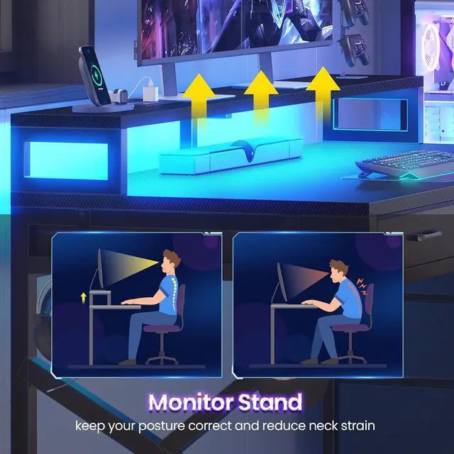 Reversible DeskThis L-shaped computer table can be installed in a left-right swap manner. There are two ways of use. You can assemble it freely according to the specific space design and usage habits of your family.The gaming table is equipped with a monitor stand to reduce neck fatigue and provide a better gaming experience.