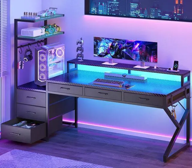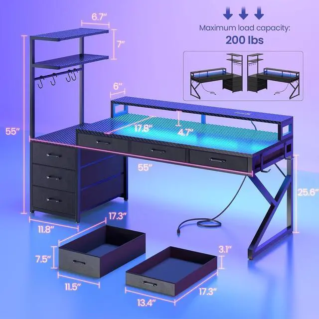 55" Gaming Desk with 6 Drawers, Corner Gaming Desk with Storage & LED Lights, Reversible PC Desk with Power Outlet, Corner Computer Desk with Hutch, Monitor Stand, Side Hook, Carbon Fiber Black