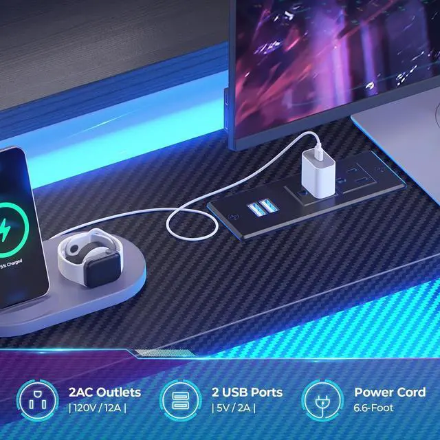 Power OutletsThis computer desk has a built-in power supply with 2 AC power sockets and 2 USB charging ports, which can easily charge 4 devices such as tablets, printers, and mobile phones at the same time. You can focus on enjoying the process of work, study and games without worrying about the trouble caused by insufficient power of the device.
