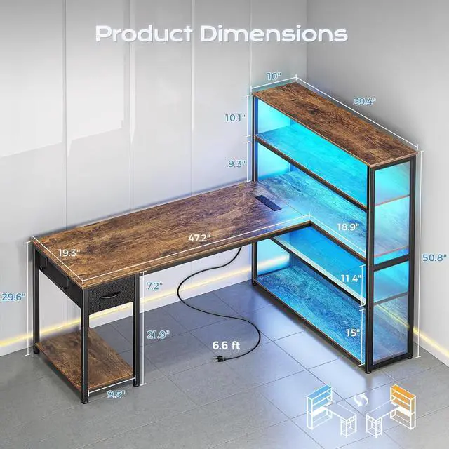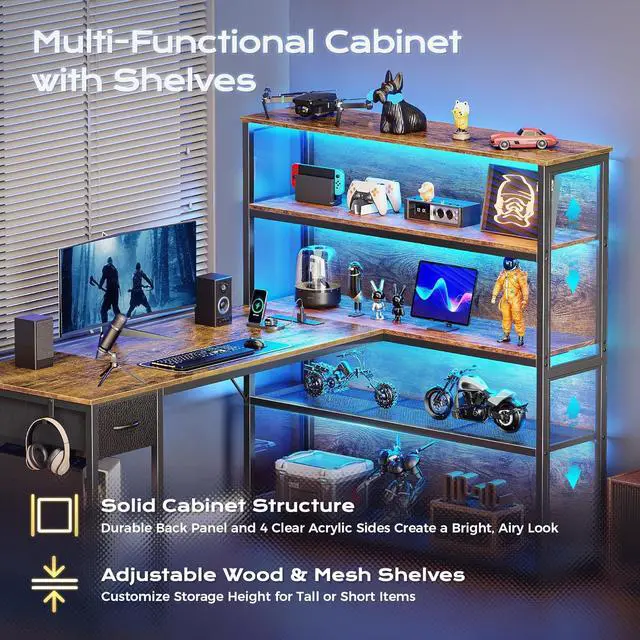 57 Inch L Shaped Gaming Computer Desk with Larger Open Cabinet, Reverisble Office Desk with Power Outlets, LED Lights, Work Desk, Fabric Drawer, Adjustable Wood and Mesh Shelf, Rustic Brown