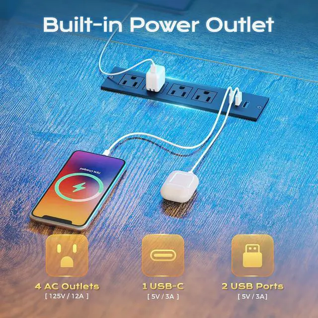 Built-in Power StripCharge all your devices right on this work desk for home office no messy cables, no running out of outlets. With 4 AC outlets, 2 USB ports, and 1 Type-C port, your PC, monitors, and phone all stay powered and organized