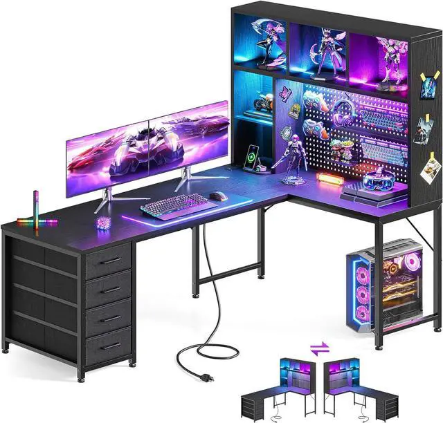 63" L Shaped Gaming Desk with Hutch, Storage & Shelves, L Shaped Desk with 4 Drawers, Inserted LED Light Strip & Power Outlets, Computer Desk with Pegboard for Entertainment, Office Desk, Black