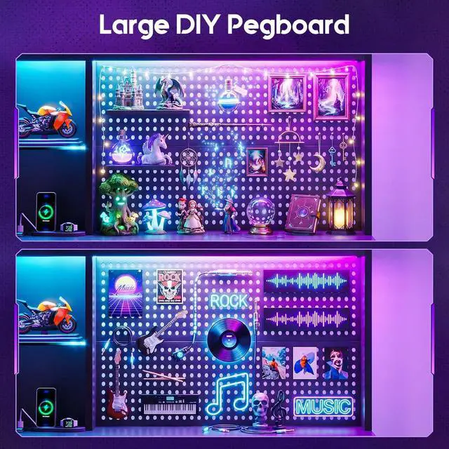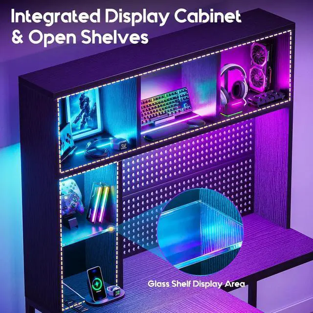 Open Display Cabinet & Pegboard WallDesigned as an l shaped desk with hutch, this l desk features an open 3-display cabinet, dual-tier shelves with glass shelf and a full-size pegboard wall. Provides flexible space to showcase helmets, collectibles, trophies, controllers and headsets, with open access and no door obstruction or glare.