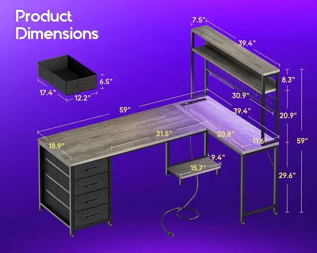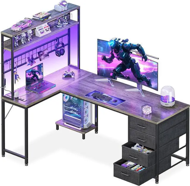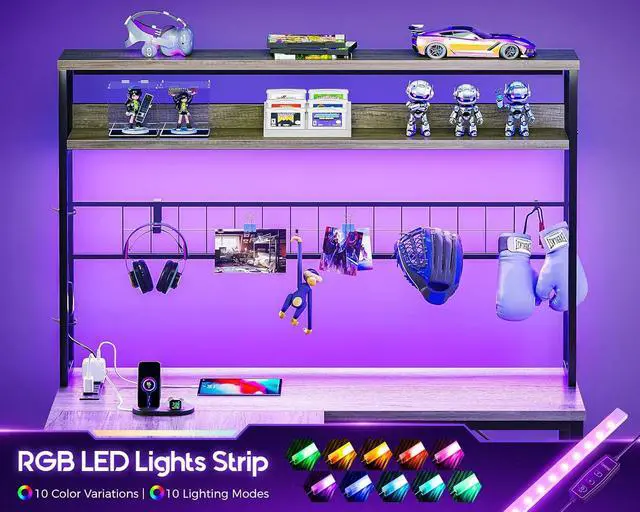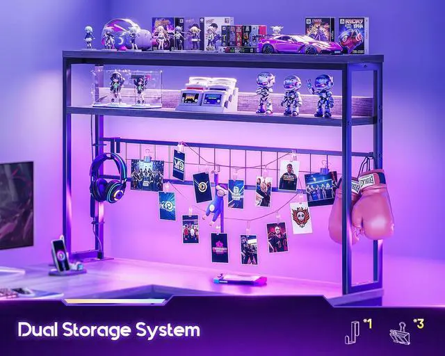 Immersive RGB Lighting Equipped with detachable LED light strips offering 10 colors, 10 dynamic modes, and 8 brightness levels, this l shaped gaming desk lets you create the perfect gaming atmosphere or a calm, focused workspace"