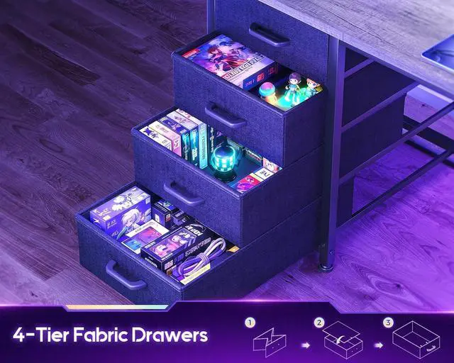 Spacious Storage DesignThis 59" gaming desk with hutch features 4 fabric drawers, a grid pegboard with 1 hook and 3 clips offering plenty of space for gaming gear, accessories, and personal items. Keep your gaming desk neat, organized, and efficient