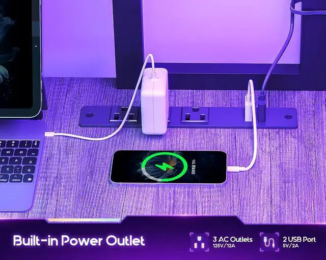 Power Outlets & USB Ports This l shaped desk includes 3 AC outlets and 2 USB ports to power your monitor, gaming gear, and mobile devices. The corner computer desk design keeps everything within easy reach, keeping you charged and focused through long sessions