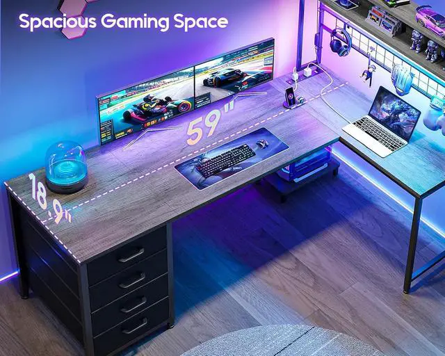 L Shaped Gaming Desk with 4 Drawers, 59" Reversible Computer Desk with Hutch and Shelves, Gamer Desk with LED Lights, Power Outlets, Home Office Corner Desk with Gird Pegboard, Gray Oak